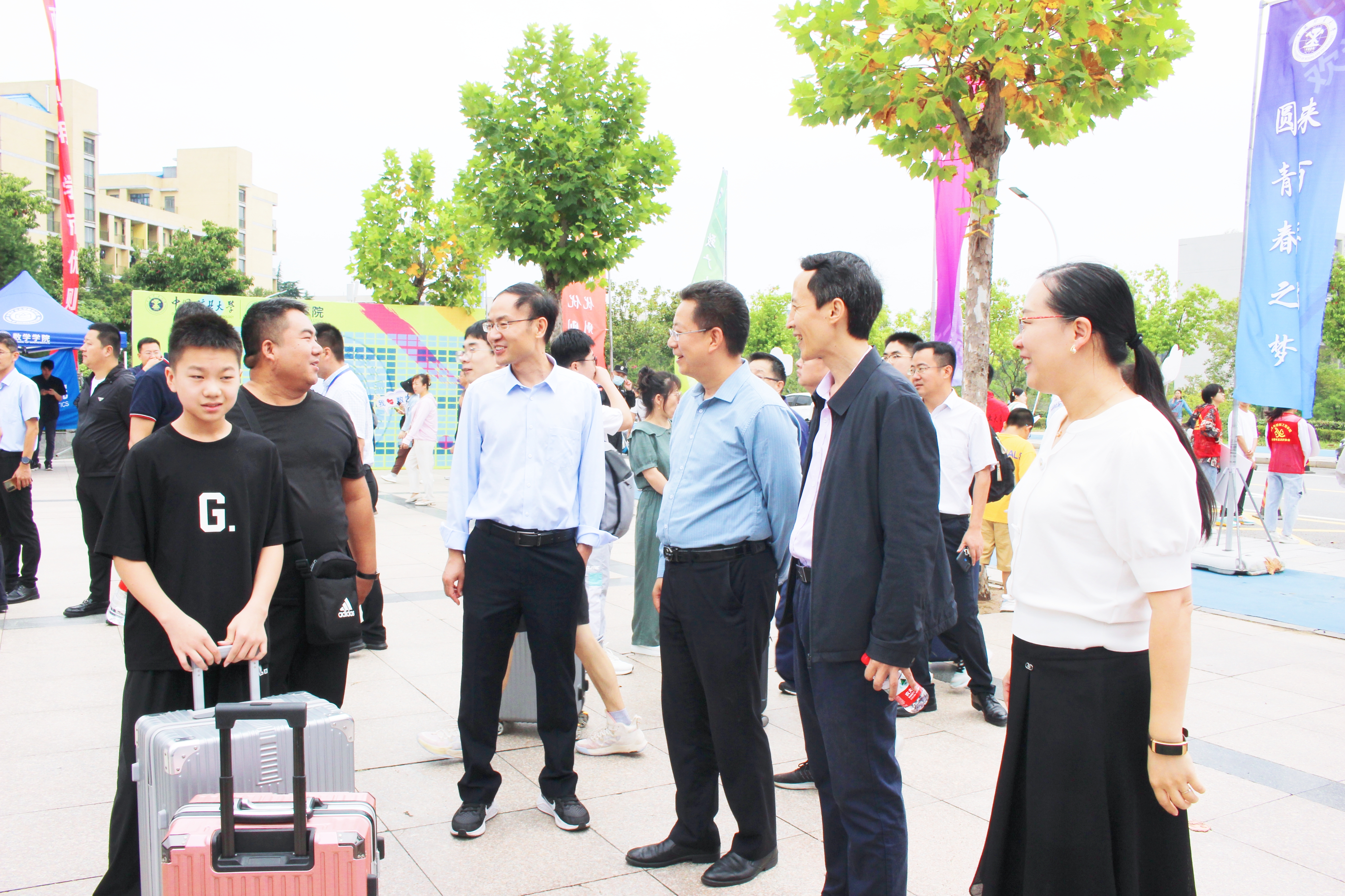 新生入学报到期间,校长宋学锋、校党委副书记李江涛等学校领导和相关部门负责人莅临学院迎新站点进行工作指导并对学院迎新工作给予了高度赞扬。学院党委书记方跃平、院长史修永、党委副书记刘宁和副院长李广文、汤道路、刘振等学院领导分别到南湖校区和文昌校区慰问现场工作人员和志愿者,与新生、新生家长、迎新工作人员展开交流,他们向2023级新生的到来表达了诚挚的欢迎与衷心的祝愿,并与部分新生合影留念。
