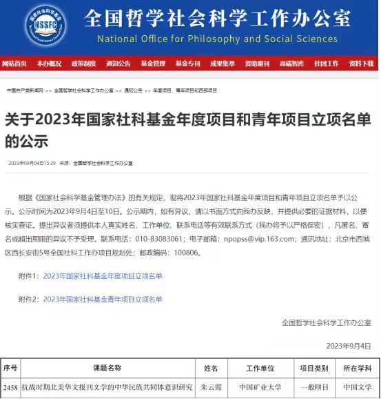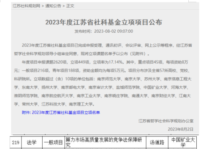 教师朱云霞副教授主持的《抗战时期北美华文报刊文学的中华民族共同体意识研究》喜获国家社科基金一般项目,汤道路副教授主持的《算力市场高质量发展的竞争法保障研究》喜获江苏省社科基金一般项目。