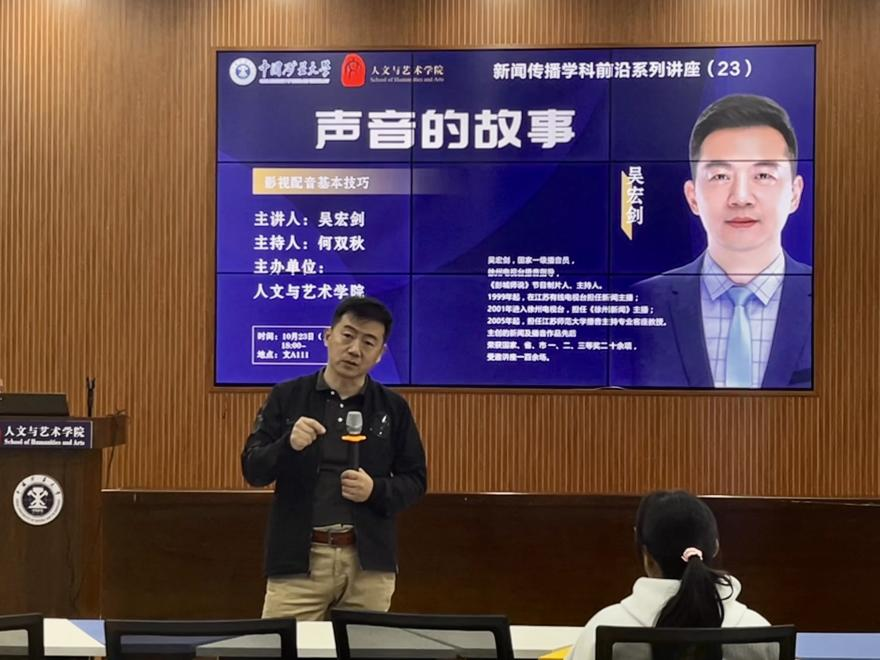 10月23日,国家一级播音员,徐州电视台《徐州新闻》主播吴宏剑应邀来人文学院,以《声音的故事》为题举办专业讲座,对欲参加“龙行杯”徐州市首届影视配音大赛的选手进行现场指导。新闻传播学系主任曹洪洋,新传美术联合党支部书记何双秋,新传系教师郑一萌,以及新闻传播学系部分研究生和本科生参加活动。活动由副教授何双秋主持。