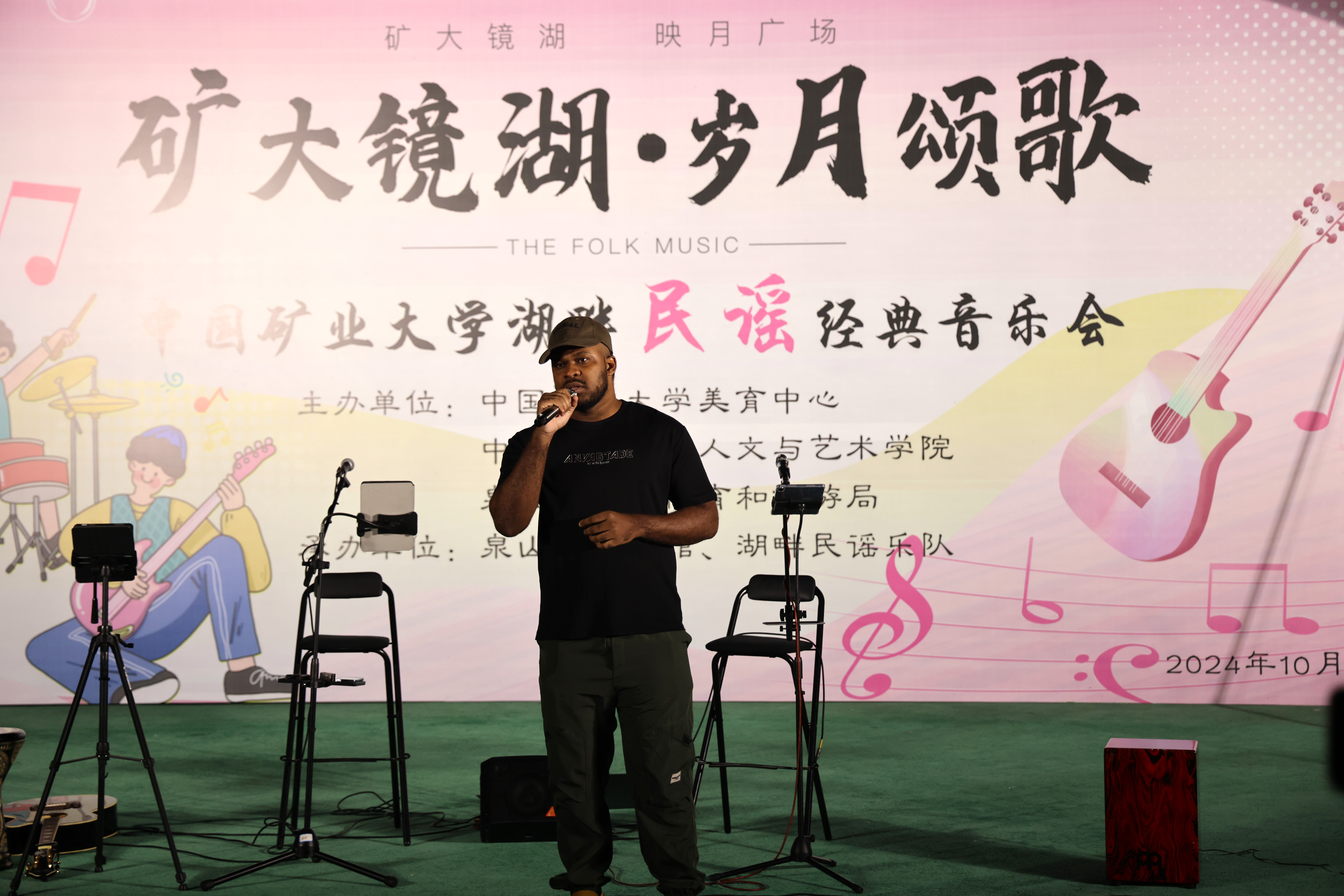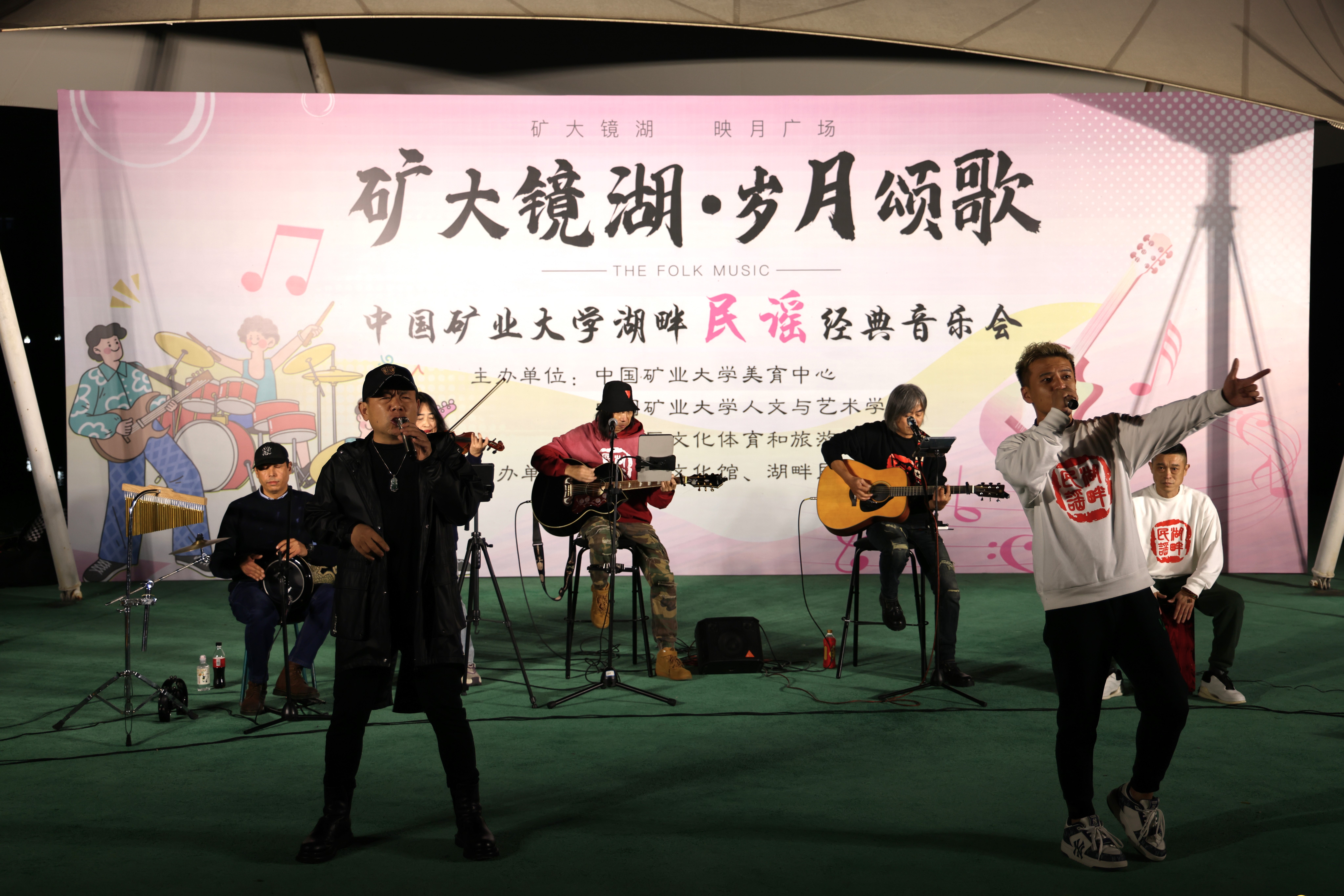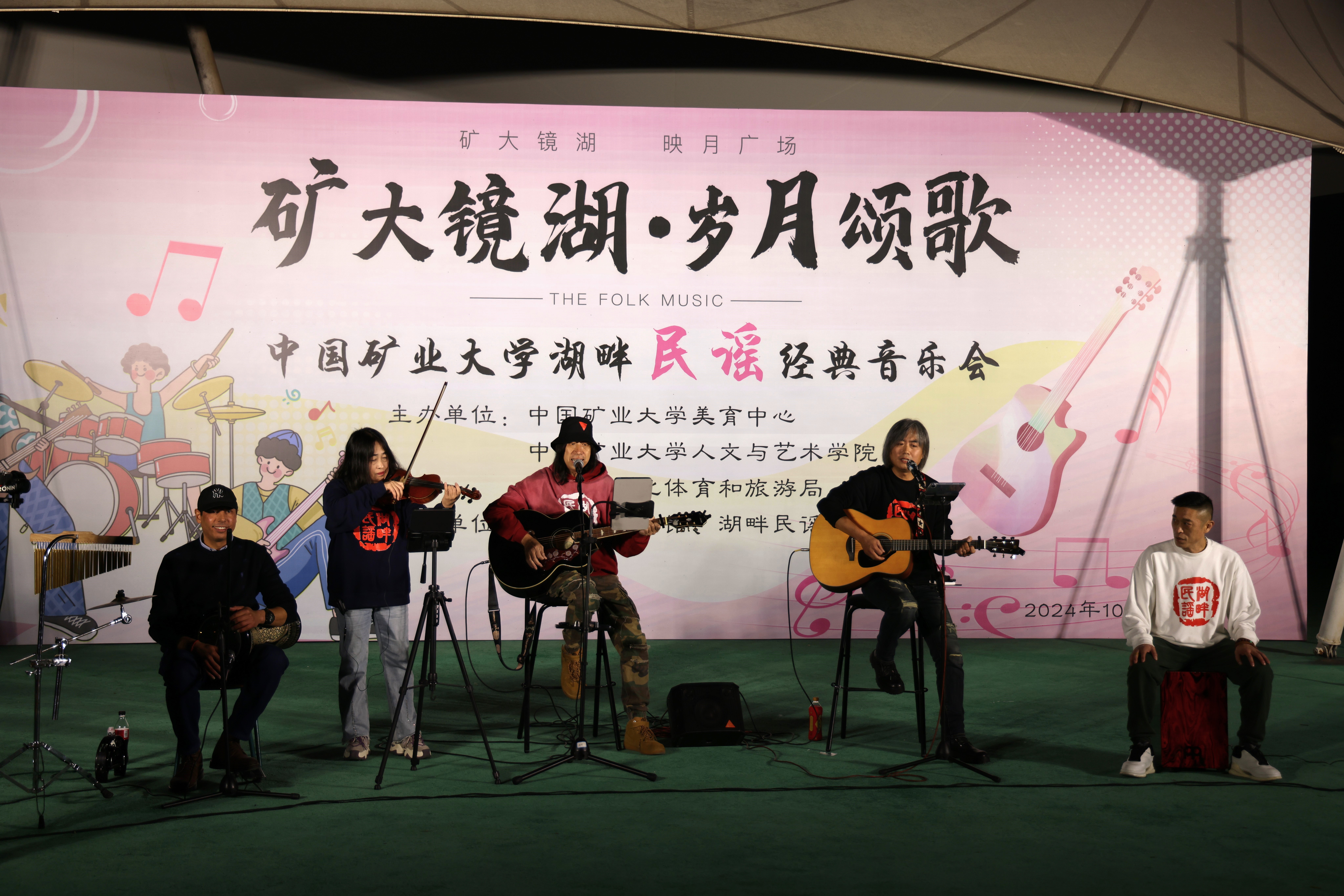 携手泉山区文化体育和旅游局,共同在矿大南湖校区镜湖映月台举办了“镜湖矿大·岁月颂歌”湖畔民谣经典音乐会。本场音乐会旨在借助中国经典民谣作品深入实施美育浸润,丰富大学生精神文化生活。音乐会吸引了众多师生前来观看,现场气氛热烈。