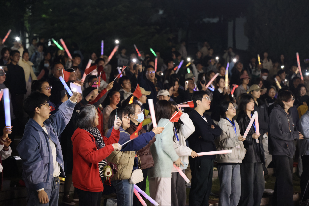 李炜灿同学带来的《水调歌头》,将苏轼的经典诗词与当代校园民谣相结合,依托音乐艺术的力量传承中华优秀传统文化。此外,还有江苏师范大学和徐州工程学院带来的《思念》《虎口脱险》等。最后,全场观众起立,挥动手中的国旗和荧光棒,和湖畔民谣乐队共同合唱《我和我的祖国》,气氛被推向了最高潮,现场充满浓烈而炽热的爱国之情。