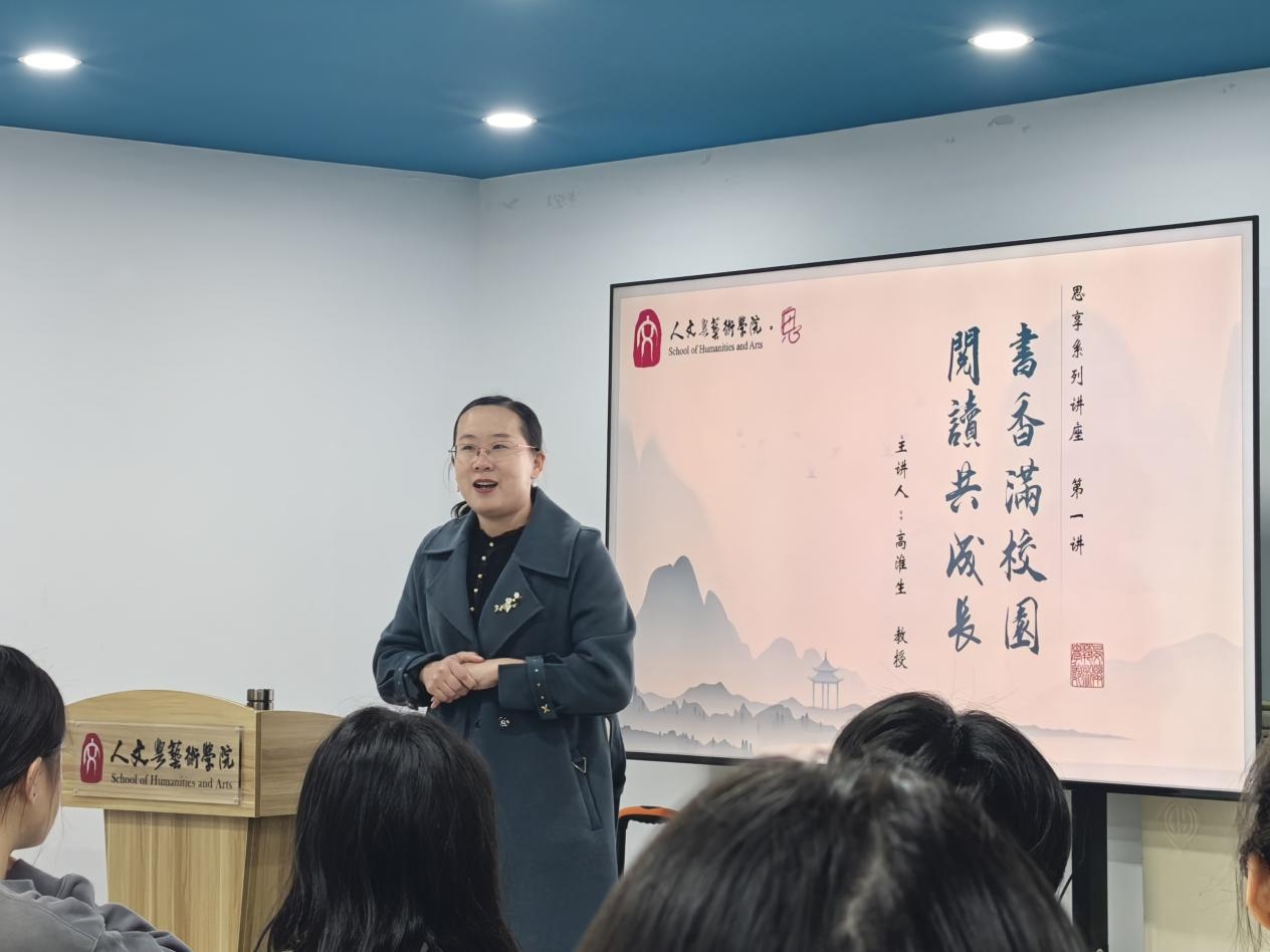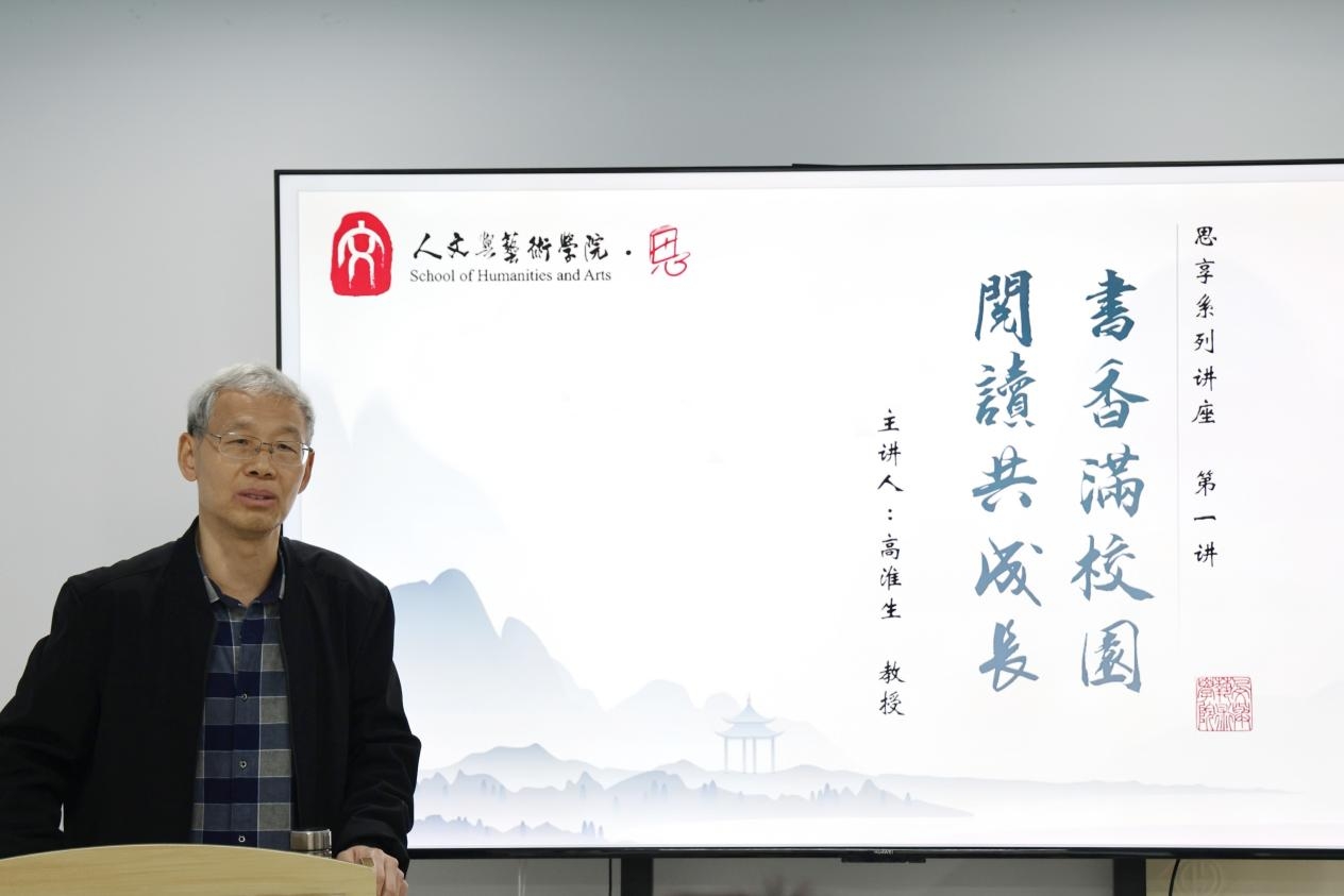 思享系列讲座第一讲在竹苑一号楼大学生活动驿站开讲。中文系教授高淮生受邀作“书香满校园,阅读共成长”主题讲座。学院党委副书记刘宁出席活动,辅导员张瑞亭、刘青以及网络与新媒体专业24级部分同学参加活动。