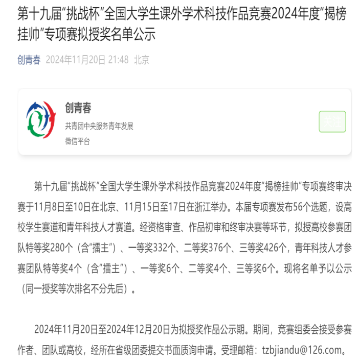 11月17日,由共青团中央、中国科协、教育部、中国社会科学院、全国学联共同主办的第十九届“挑战杯”全国大学生课外学术科技作品竞赛“揭榜挂帅”专项赛顺利收官。由麻豆av