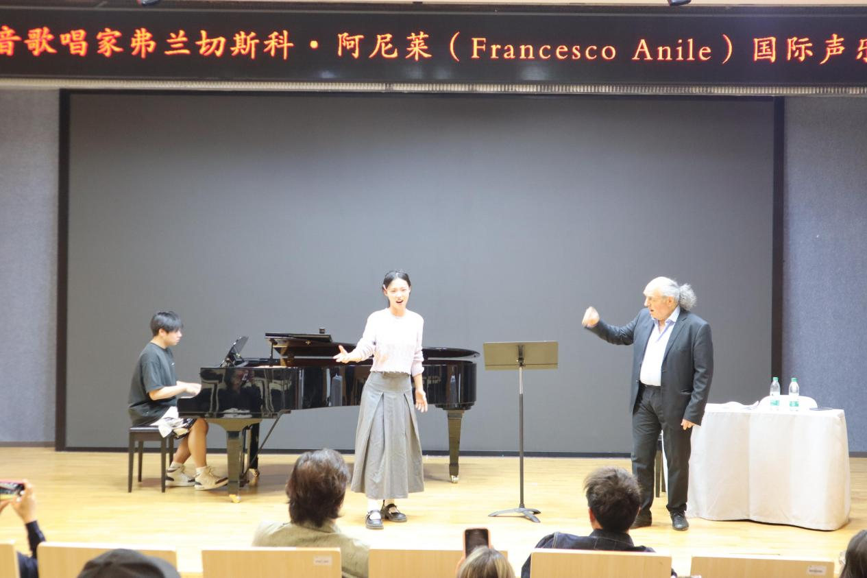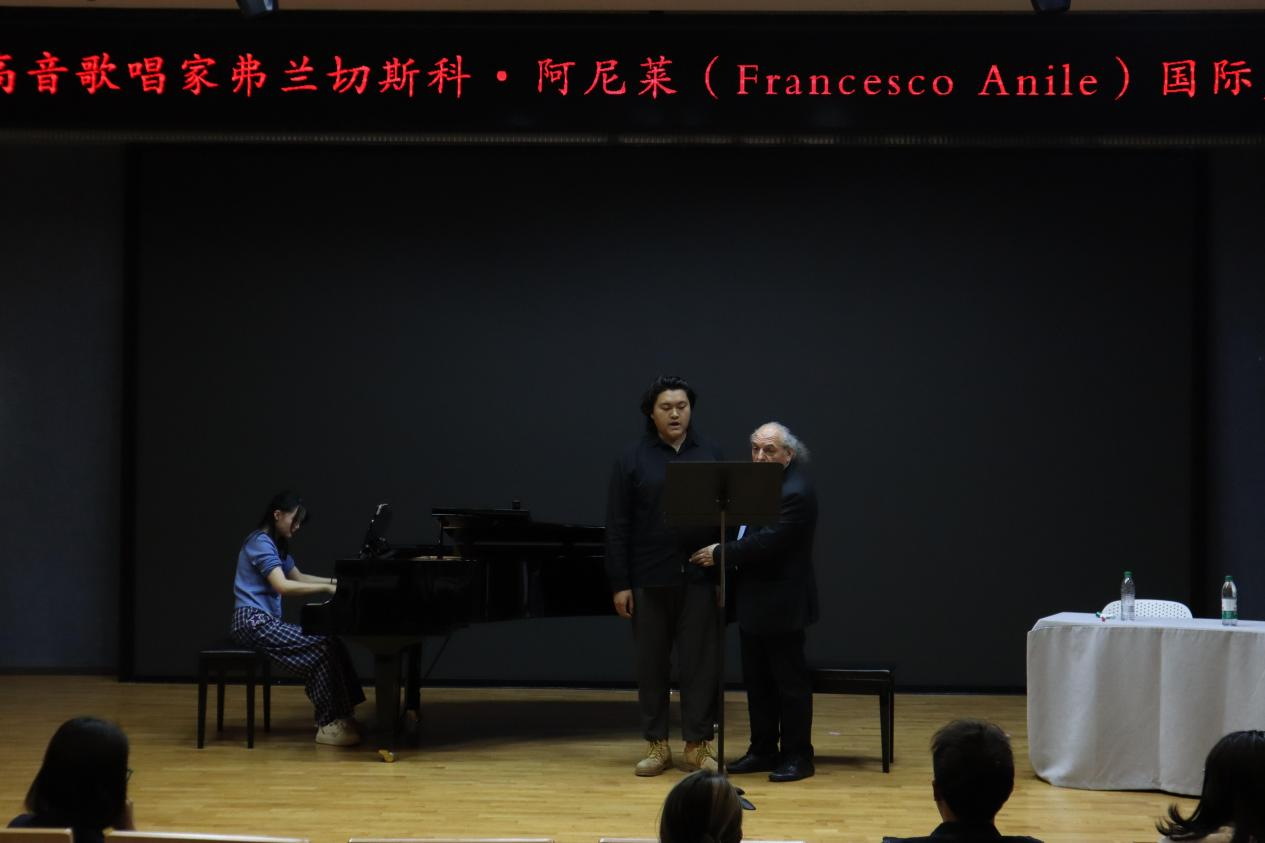 会后,声乐大师班在学院音乐厅开班,音乐系部分师生参加。阿尼莱以“人声乐器的专业塑造”为主题,讲解声乐基础理论,阐释呼吸控制、共鸣原理等要素。十余位声乐专业的同学依次表演世界著名歌剧选段,阿尼莱采用“诊断式”点评,提出改进方案并示范教学。课程最后,阿尼莱与音乐系教师宋国旭、Francesco Algeri共同登台,演唱了普契尼歌剧《西部女郎》中的《请让他相信》《穿上戏袍》等经典唱段。