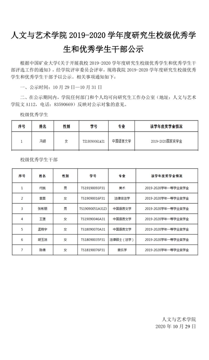 麻豆av 2019-2020学年度研究生校级优秀学生和优秀学生干部公示