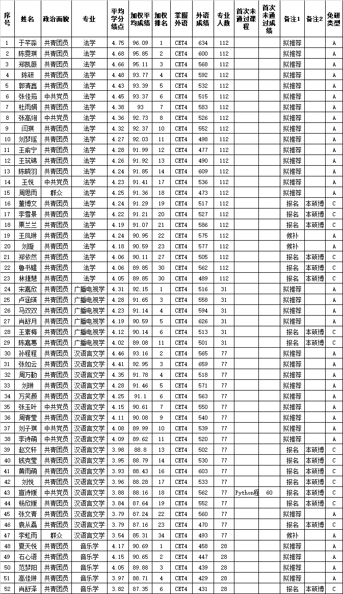 根据学校和学院2024年推荐优秀应届本科毕业生免试攻读研究生工作的通知,选拔2024年本硕博连读、本科直博优秀学生工作的通知,及实施办法,经学生自愿申请、学院推荐免试研究生工作领导小组审查,现将麻豆av 拟推荐2024年普通类免试攻读研究生情况、报名2024年本硕博连读学生情况予以公示,公示期为2023年9月22日-9月24日,公示期间如有问题,请联系学院教学管理办公室,联系人:王老师,电话:83590112。