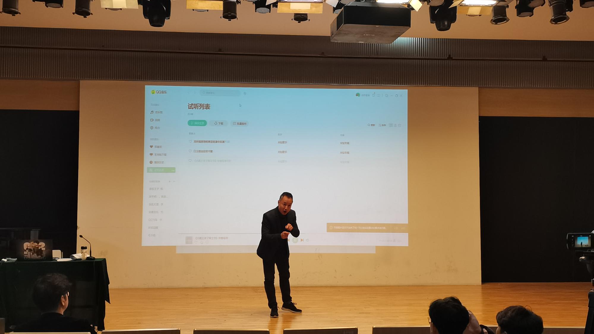 会议伊始,朱老师介绍了戏曲的起源发展,表达了自己对传统文化的热爱以及重振戏曲辉煌的信心。但针对戏曲行业式微的现状,他也表示了深切担忧,并提出希望国家完善行业机制,让演员们再无后顾之忧。同时,他表示艺术给人以美的感受,演员应当摆正态度,遵循自然规律,演适合自己的角色,展现戏曲最美的一面;此外,他还强调演员要注重“生活的厚度”,即艺术来源于生活。随后,朱老师现场还原了柳琴戏《喝面叶》片段,展示了其高超的技艺;同时亲自教学柳琴戏的经典动作,与同学进行互动。