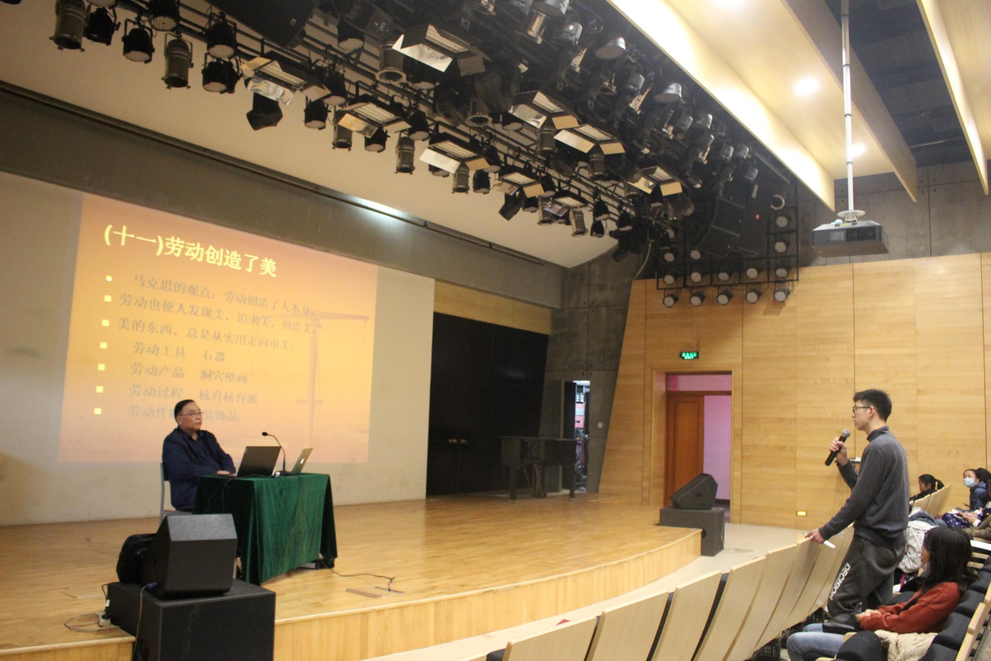 在诠释过程中,姚文放教授引经据典,巧妙运用古今中外大家之言,带领同学们一点点走入这个与“美”不可分割的世界。从古希腊神话到孔孟之道,从诗经庄子到《巴黎圣母院》,从俄国民主主义思想家的精准定义到鲁迅对“社会性”的独到见解,最后姚文放教授以马克思的观点结尾——劳动创造了人本身,劳动也使人发现美,追求美,创造美,美的东西,总是从实用走向审美。