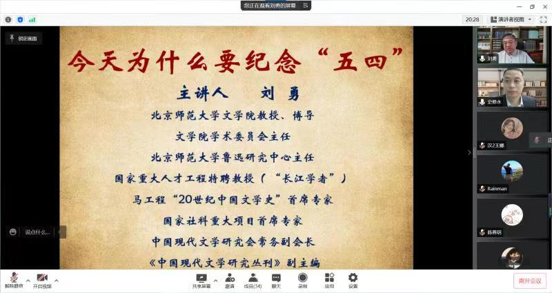 于线上开展了“人文艺术名家系列讲座”第二十一讲——“今天为什么要纪念‘五四’”主题讲座。本次讲座由北京师范大学文学院著名教授、博士生导师、文学院学术委员会主任刘勇主讲,麻豆av