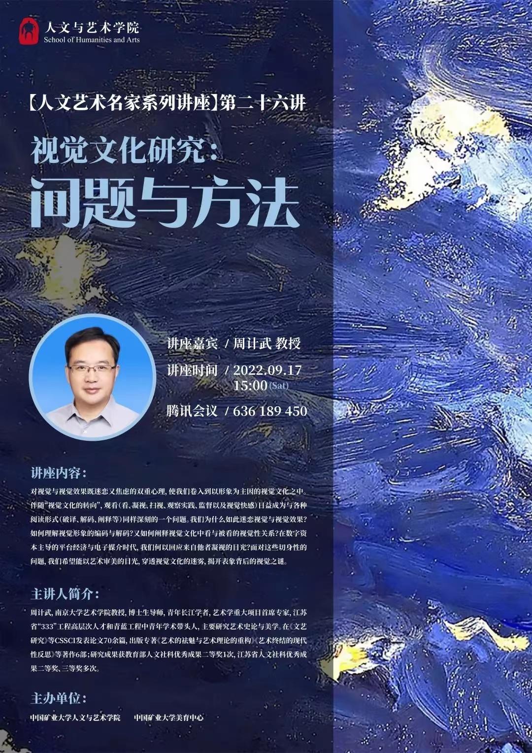 主讲人简介:周计武,南京大学艺术学院教授,博士生导师,青年长江学者,艺术学重大项目首席专家,江苏省“333”工程高层次人才和青蓝工程中青年学术带头人,主要研究艺术史论与美学。在《文艺研究》等CSSCI发表论文70余篇,出版专著《艺术的祛魅与艺术理论的重构》《艺术终结的现代性反思》等著作6部;研究成果获教育部人文社科优秀成果二等奖1次,江苏省人文社科优秀成果二等奖、三等奖多次。
