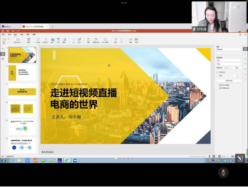 10月28日下午,广电系邀请徐州市微电影产业协会会长、江苏省自媒体联盟理事刘冬梅,通过线上会议方式开展了“走进短视频直播电商的世界”的主题讲座,广电系主任曹洪洋主持讲座。刘冬梅会长凭着自己在业界积累的经验和丰富的阅历,为师生讲述了短视频电商直播行业的相关情况以及从事该行业的经验和体会。