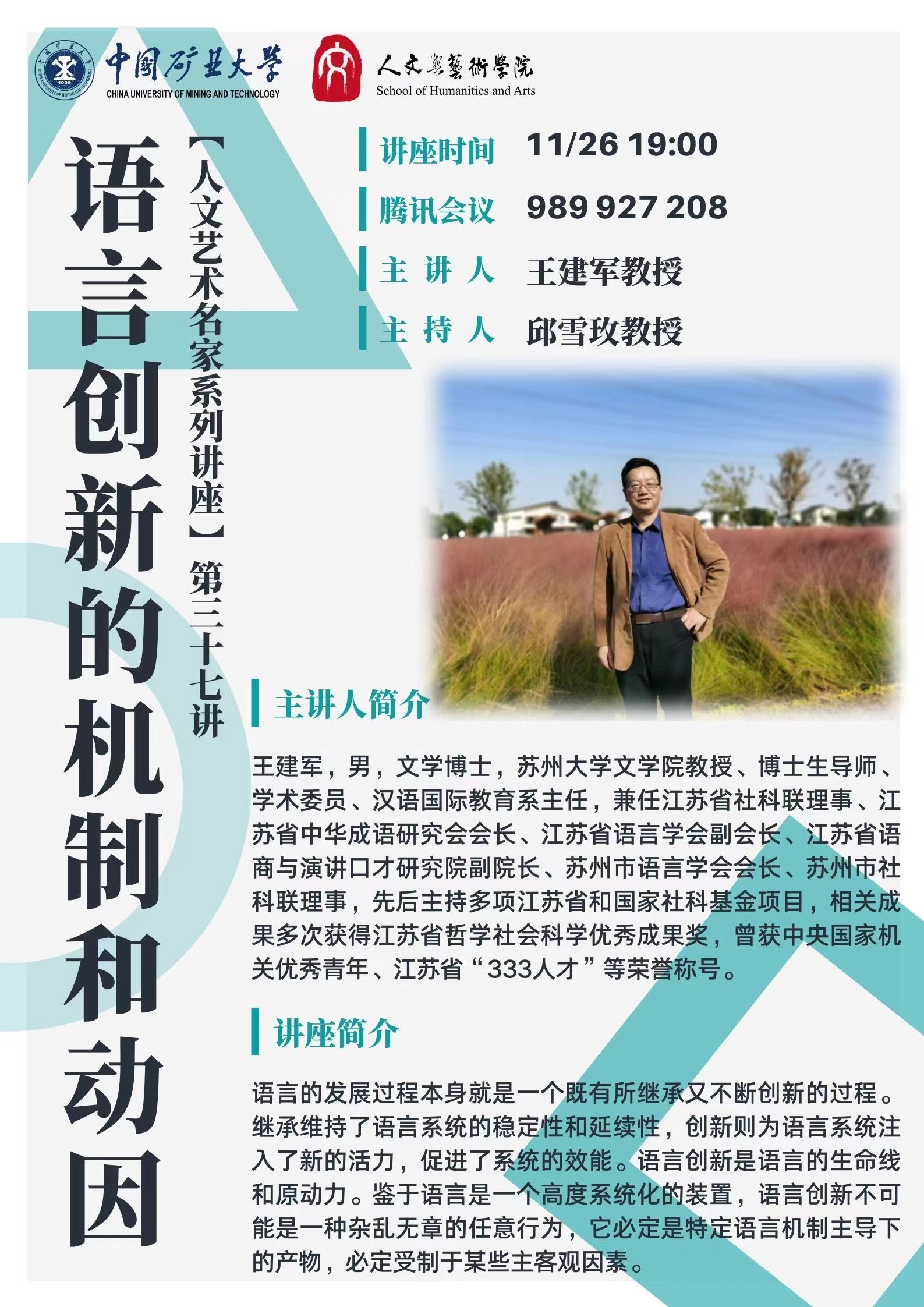 主讲人简介:王建军,男,文学博士,苏州大学文学院教授、博士生导师、学术委员、汉语国际教育系主任,兼任江苏省社科联理事、江苏省中华成语研究会会长、江苏省语言学会副会长、江苏省语商与演讲口才研究院副院长、苏州市语言学会会长、苏州市社科联理事,先后主持多项江苏省和国家社科基金项目,相关成果多次获得江苏省哲学社会科学优秀成果奖,曾获中央国家机关优秀青年、江苏省“333人才”等荣誉称号。