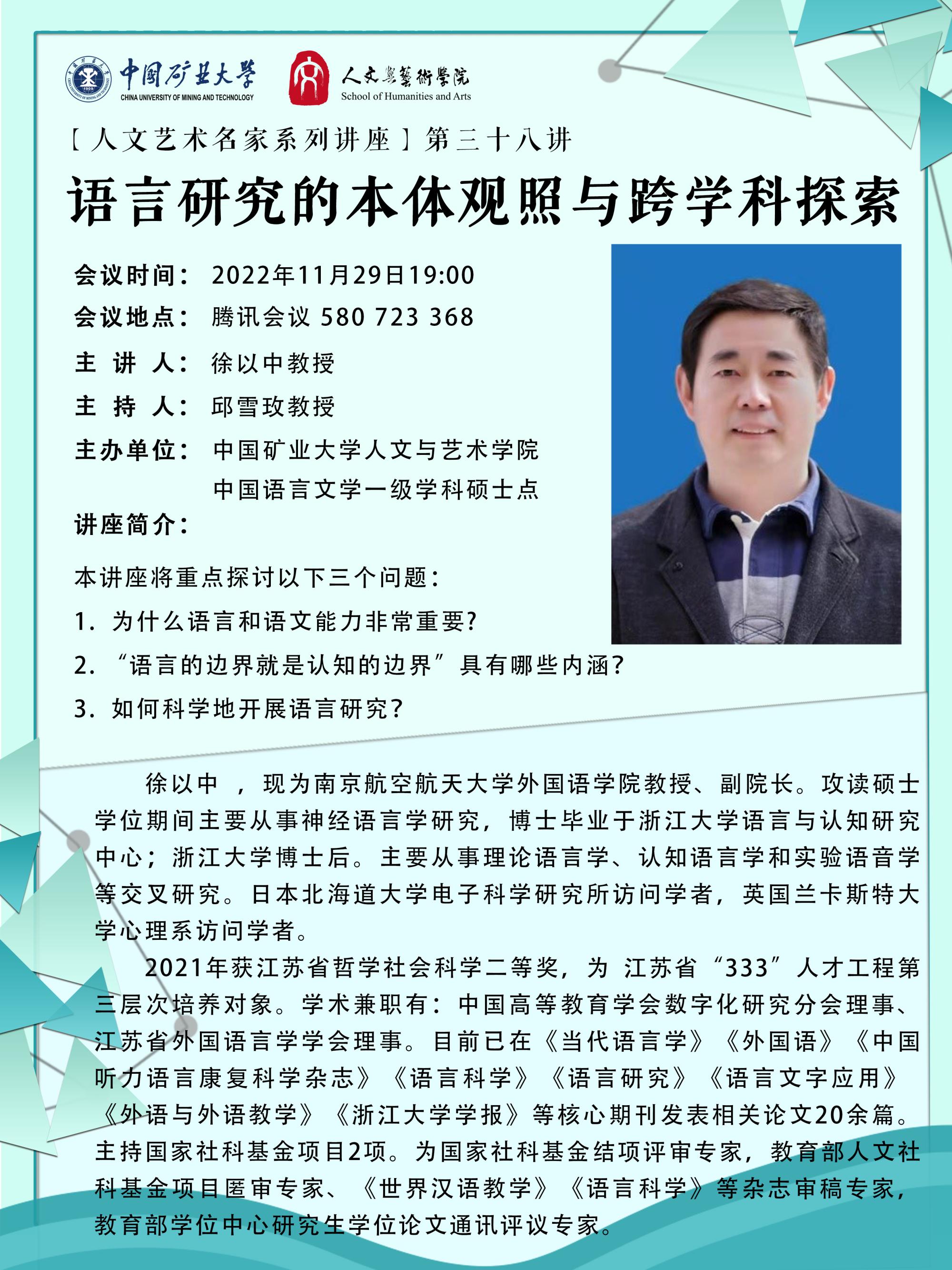 主讲人简介:徐以中 现为南京航空航天大学外国语学院教授、副院长。攻读硕士学位期间主要从事神经语言学研究,博士毕业于浙江大学语言与认知研究中心;浙江大学博士后。主要从事理论语言学、认知语言学和实验语音学等交叉研究。日本北海道大学电子科学研究所访问学者,英国兰卡斯特大学心理系访问学者。 2021年获江苏省哲学社会科学二等奖,为 江苏省“333”人才工程第三层次培养对象。学术兼职有:中国高等教育学会数字化研究分会理事、江苏省外国语言学学会理事。目前已在《当代语言学》、《外国语》、《中国听力语言康复科学杂志》、《语言科学》、《语言研究》、《语言文字应用》、《外语与外语教学》、《浙江大学学报》等核心期刊发表相关论文20余篇。主持国家社科基金项目2项。为国家社科基金结项评审专家,教育部人文社科基金项目匿审专家、《世界汉语教学》、《语言科学》等杂志审稿专家,教育部学位中心研究生学位论文通讯评议专家。