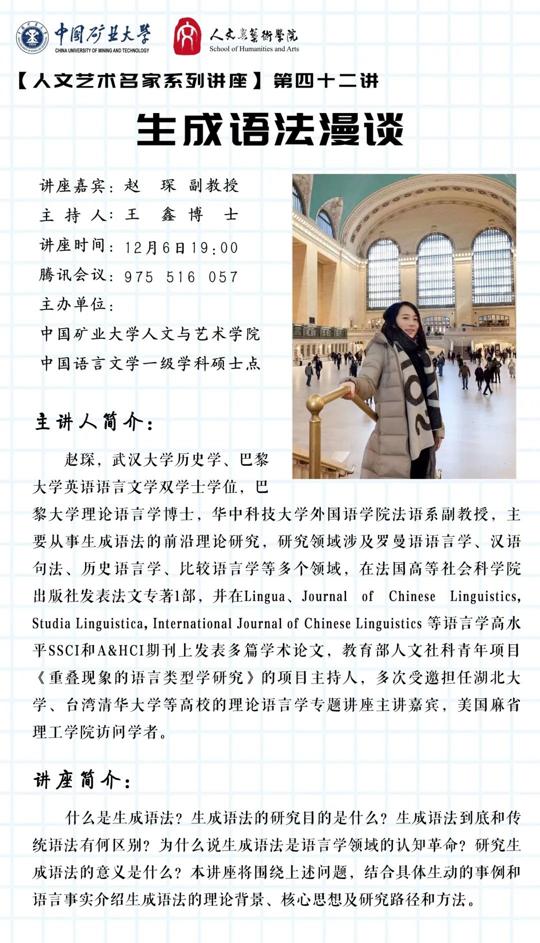 主讲人简介:赵琛,武汉大学历史学、巴黎大学英语语言文学双学士学位,巴黎大学理论语言学博士,华中科技大学外国语学院法语系副教授,主要从事生成语法的前沿理论研究,研究领域涉及罗曼语语言学、汉语句法、历史语言学、比较语言学等多个领域,在法国高等社会科学院出版社发表法文专著1部,并在Lingua、Journal of Chinese Linguistics, Studia Linguistica, International Journal of Chinese Linguistics 等语言学高水平SSCI和A&HCI期刊上发表多篇学术论文,教育部人文社科青年项目《重叠现象的语言类型学研究》的项目主持人,多次受邀担任湖北大学、台湾“清华大学”等高校的理论语言学专题讲座主讲嘉宾,美国麻省理工学院访问学者。