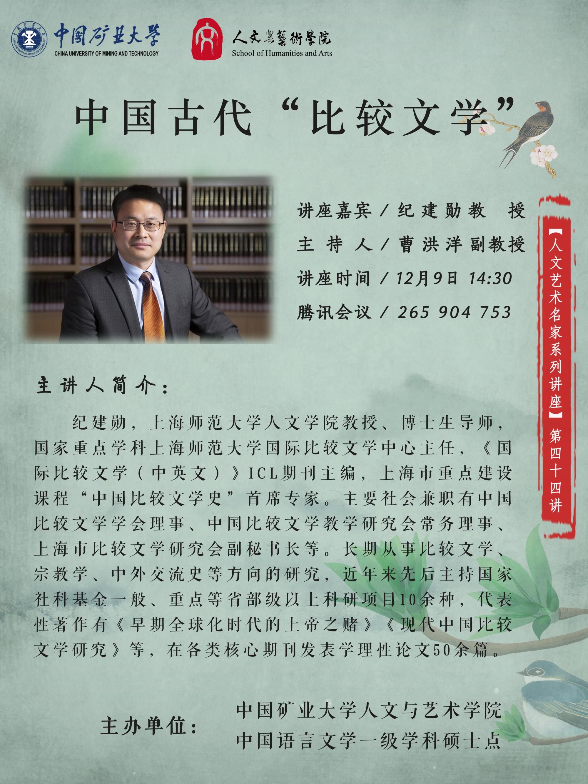 个人简介:纪建勋,上海师范大学人文学院教授、博士生导师,国家重点学科上海师范大学国际比较文学中心主任,《国际比较文学(中英文)》ICL期刊主编,上海市重点建设课程“中国比较文学史”首席专家。主要社会兼职有中国比较文学学会理事、中国比较文学教学研究会常务理事、上海市比较文学研究会副秘书长等。长期从事比较文学、宗教学、中外交流史等方向的研究,近年来先后主持国家社科基金一般、重点等省部级以上科研项目10余种,代表性著作有《早期全球化时代的上帝之赌》《现代中国比较文学研究》等,在各类核心期刊发表学理性论文50 余篇。