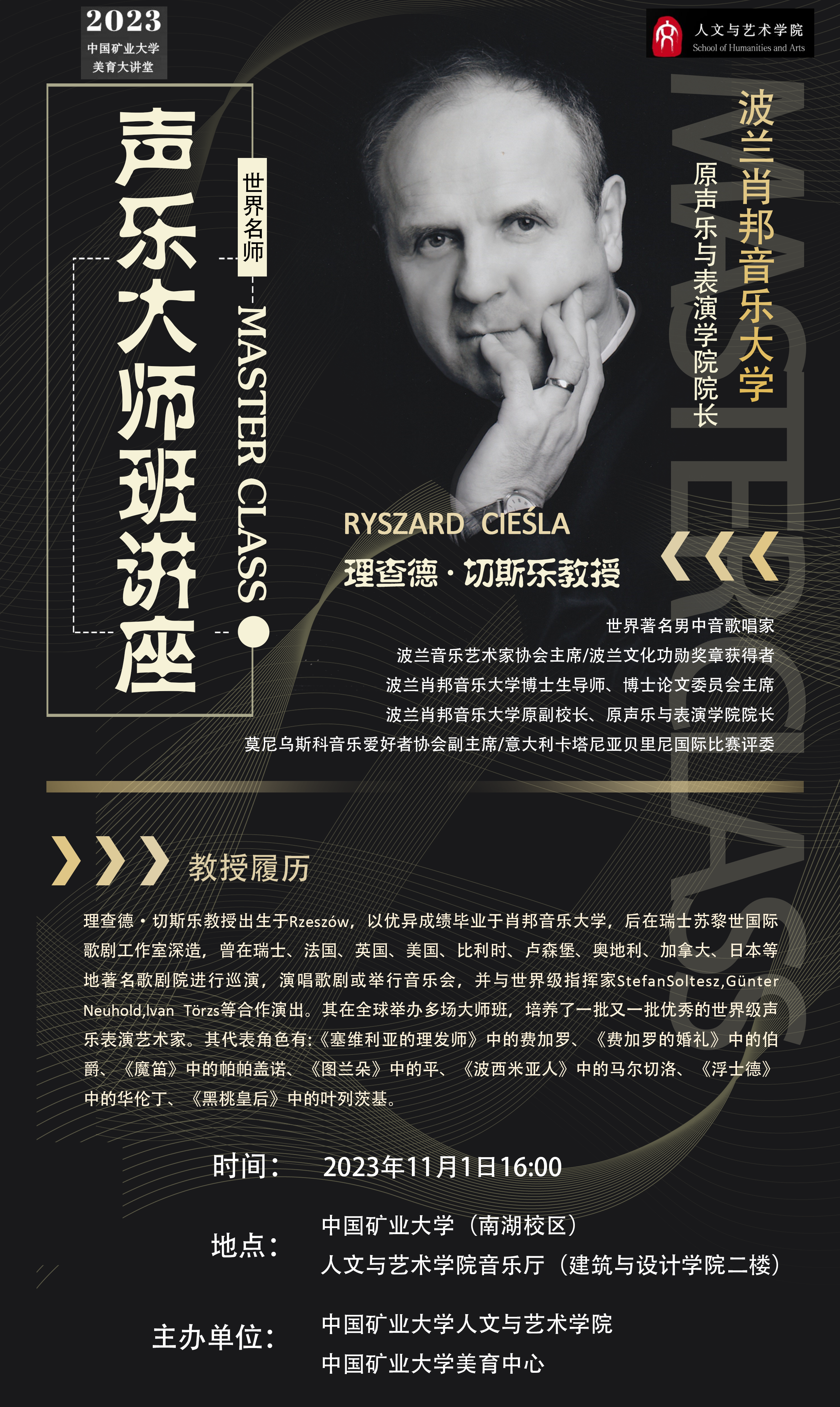 RYSZARD CIEŚLA教授作为歌剧总监,代表艺术军乐队、罗穆阿德·特劳格特爱乐乐团新剧院、华沙犹太剧院的几场音乐演出。此外,斯坦尼斯拉夫·莫纽斯科导演的歌剧《鬼屋》于2007年在芝加哥罗斯蒙特剧院、2017年在芝加哥哥白尼中心、2019年在华沙大剧院的室内舞台上演出,并于2018年在长江艺术节上演出室内乐版,并于2019年在中国各大学演出室内乐版。2011年在吉林艺术大学、武汉中南民族大学、湖南师范大学、北京中央音乐学院演出莫扎特的《我爱你》(2011年戈尔佐夫爱乐乐团演出,华沙2012、2013、2017和2018,塞维利亚2012,伊斯坦布尔2012,凯尔策2013,克里尼察2018)。此外,《唐·乔瓦尼》还与该系学生一起在华沙室内歌剧院舞台(2014年7月、2017年)和戈尔佐斯卡Filharmonia Gorzowska(2014年9月)的“华沙莫扎特节”上演出。此外,《尤金·奥涅金》还在2016年华沙歌剧院、2017年和2018年室内舞台以及Rzeszów 2018年进行了演出。此外,儿童音乐剧《俄耳菲奥与欧律狄斯》(2014年9月,华沙)。