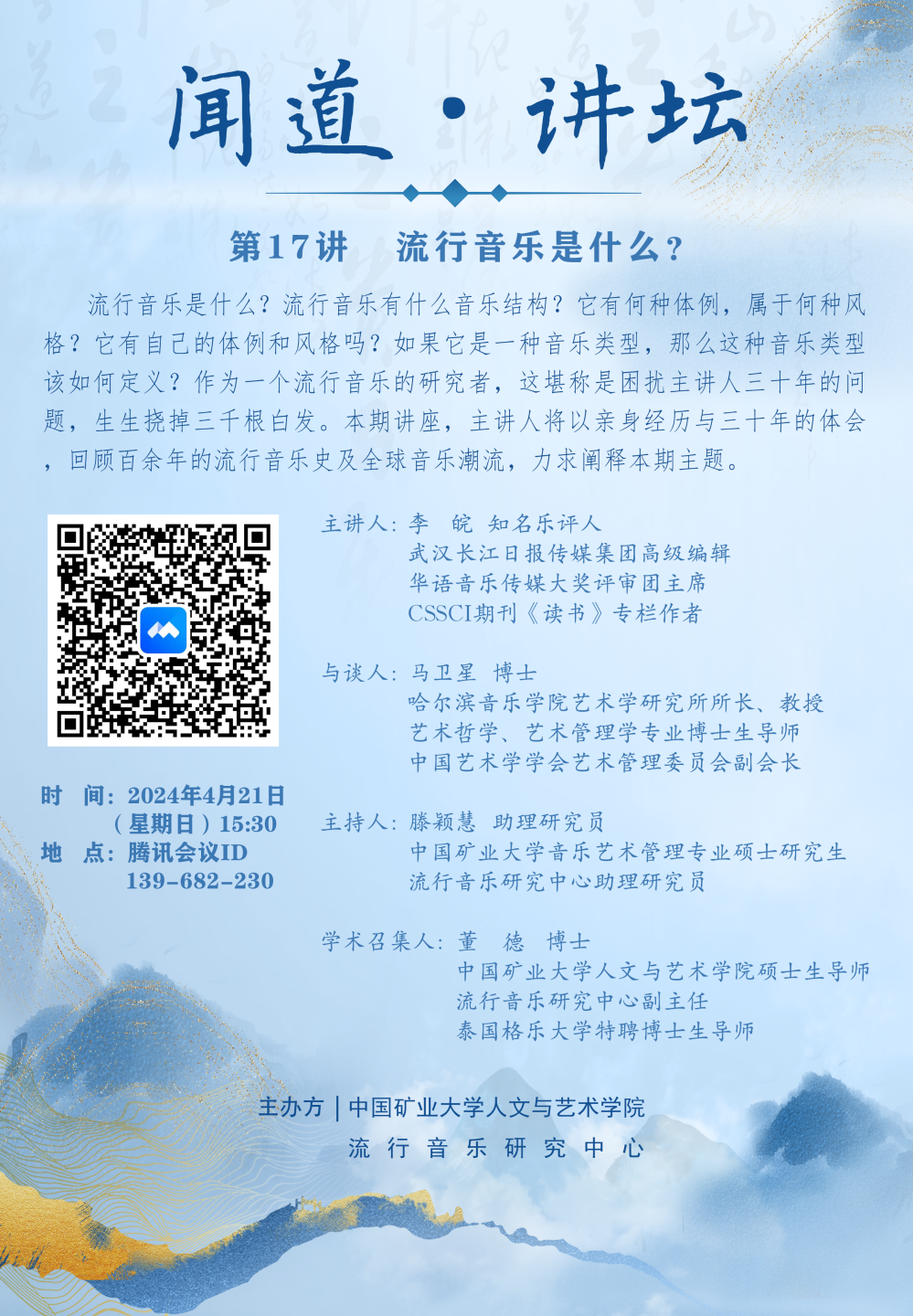 与流行音乐研究中心联合主办的“闻道”系列讲坛的第17讲顺利开展。本期的主题为“流行音乐是什么?”。由知名乐评人李皖担任主讲人,哈尔滨音乐学院艺术学研究所所长马卫星教授担任与谈人,麻豆av