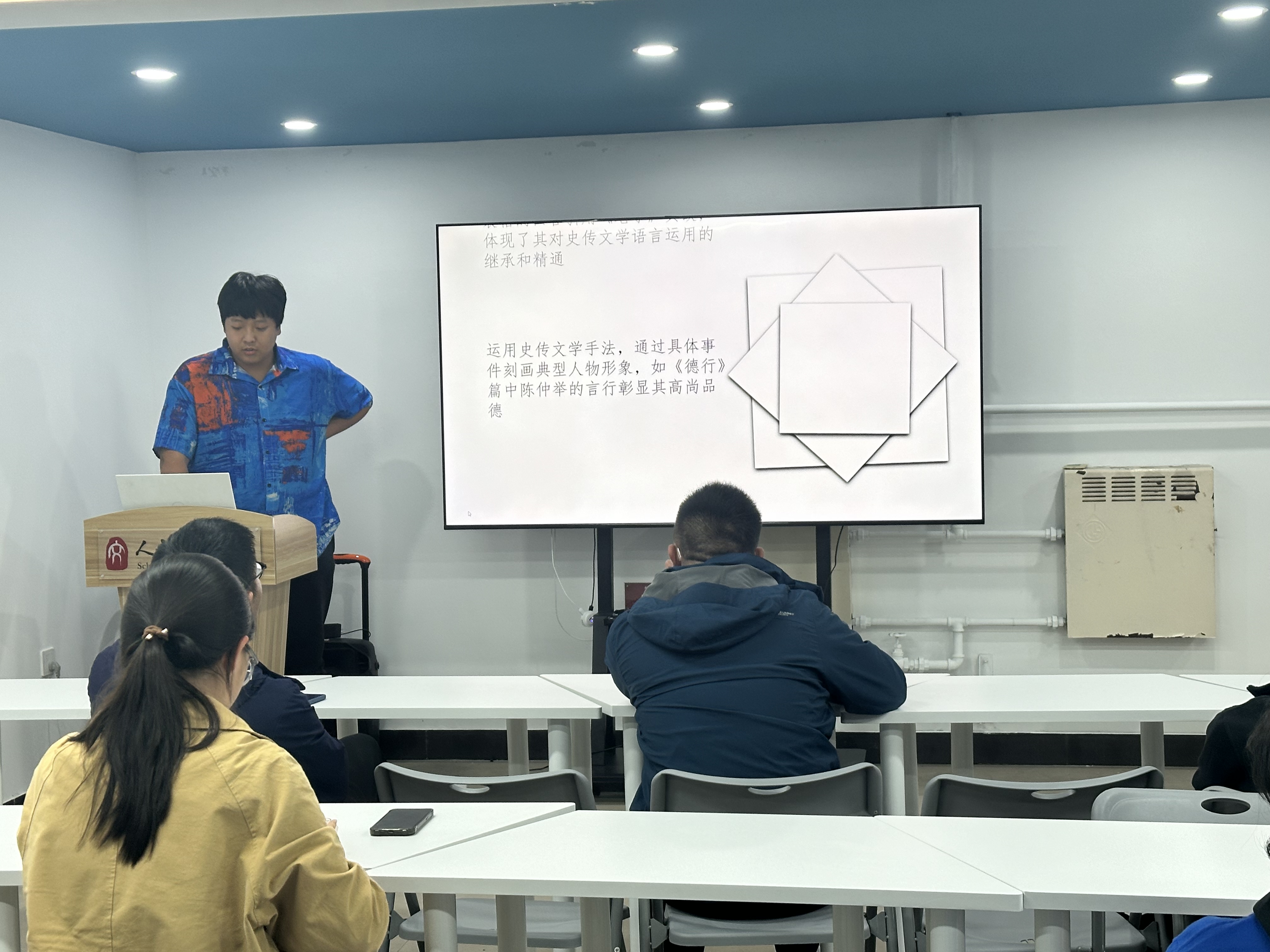 本期读书会的阅读书目是《世说新语》,活动分别从“为何而读”、“知人论世”和“浅看目录”展开,周旸为大家介绍了阅读《世说新语》的意义、作者刘义庆的生平信息和《世说新语》的组成部分。之后同学分成五个小组分别进行展示。第一组同学以生动活泼、诙谐有趣的故事演绎方式先后为大家带来了出自《世说新语》中《言语》第二、《伤逝》第一及《惑溺》第三十五的《小时了了》《学驴叫》和《韩寿偷香》三场精彩的表演,分别讲述了孔融的聪颖早慧、曹丕对朋友独特悼念方式以及韩寿和贾充之女的爱情三个故事。第二组同学为大家分享了《世说新语》中的幽默故事,如《王仲宣好驴鸣》、《刘伶醉酒》和《孔文举年十岁》,最后对魏晋人与现代人的思想进行了对比分析,涉及价值观、生死观和交友观三个方面,显示出批判性精神和辩证眼光。第三组同学展示的主题是“《世说新语》和史传文学”,他们为大家展示了该书对史传文学的继承、创新以及其与唐传奇的关联。第四组同学分享了自己阅读该书的个人感受。何昊结合鲁迅的研究,讲述了自己对魏晋时期文人与政治的关系、文学与生活的关系等方面的理解;葛瑶瑶提到了自己通过阅读《世说新语》引发的对《资治通鉴》的联想,以及《世说新语》中二则故事高度相似性的思考。第五组同学展示的是《世说新语》对后世的影响,包含为对文学创作、影视娱乐、艺术作品及教育事业四个方面,他们的分享层次分明、内容详实,加深了同学们对《世说新语》的整体思考和深入理解。