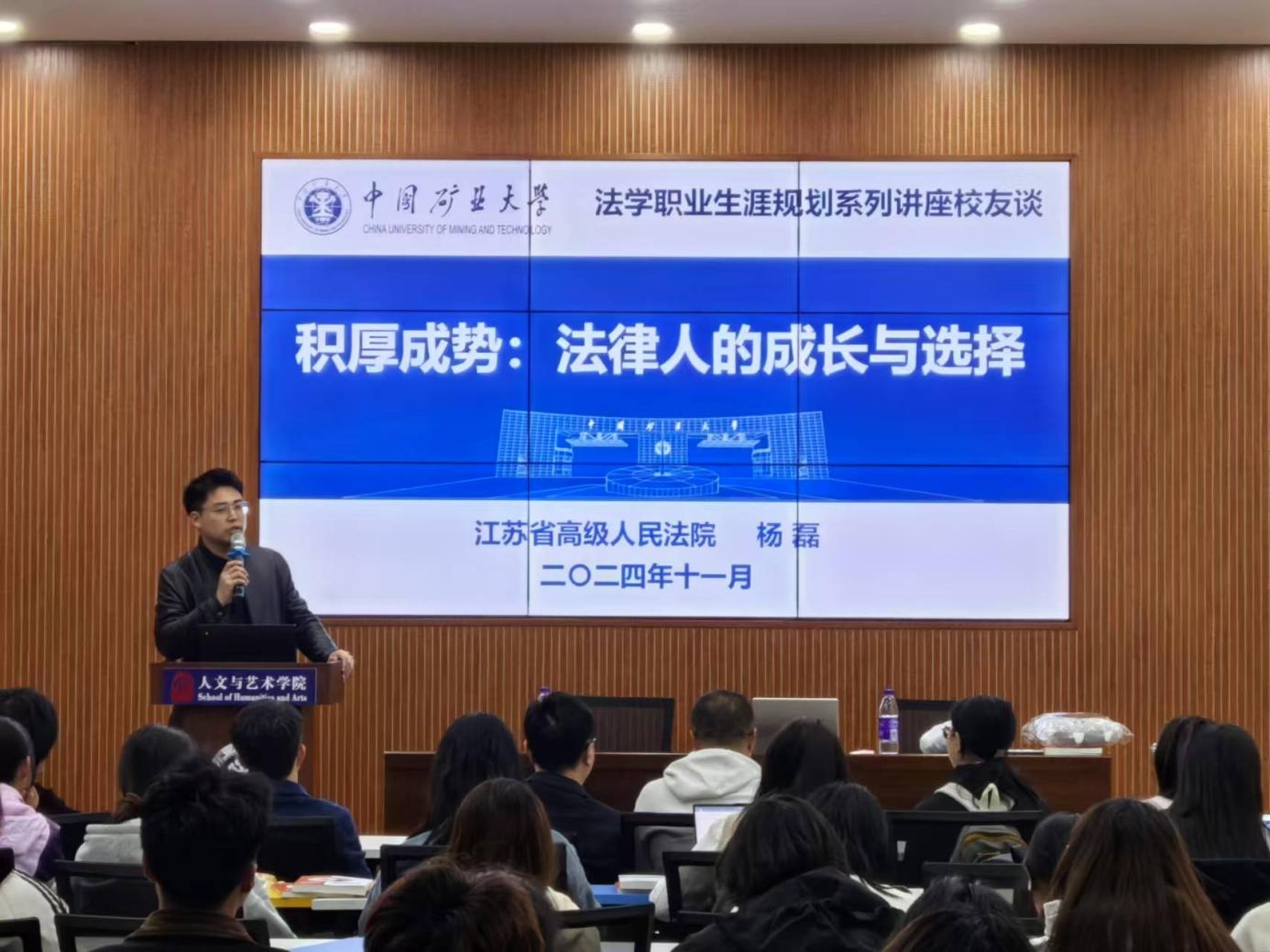 A111会议室举办。江苏省高级人民法院民六庭法官、江苏省《民法典》专家宣讲团成员、国家法官学院江苏分院兼职讲师、江苏省法院调研专家库人才杨磊应邀开展讲座,他回顾了自己求学求职经历。杨磊强调榜样的作用,他认为只有内心憧憬,身体才会坚持运作。他希望同学们可以抓住不同阶段的平台,适应新环境努力提升自己,同时找到志同道合的伙伴,携手在漫漫人生中踏出自己的道路。随后他就同学们对职业规划,岗位的选择和大学学习等问题一一解答。同学们纷纷表示对未来职业规划和现阶段的前进方向也有了更加深刻的认知。