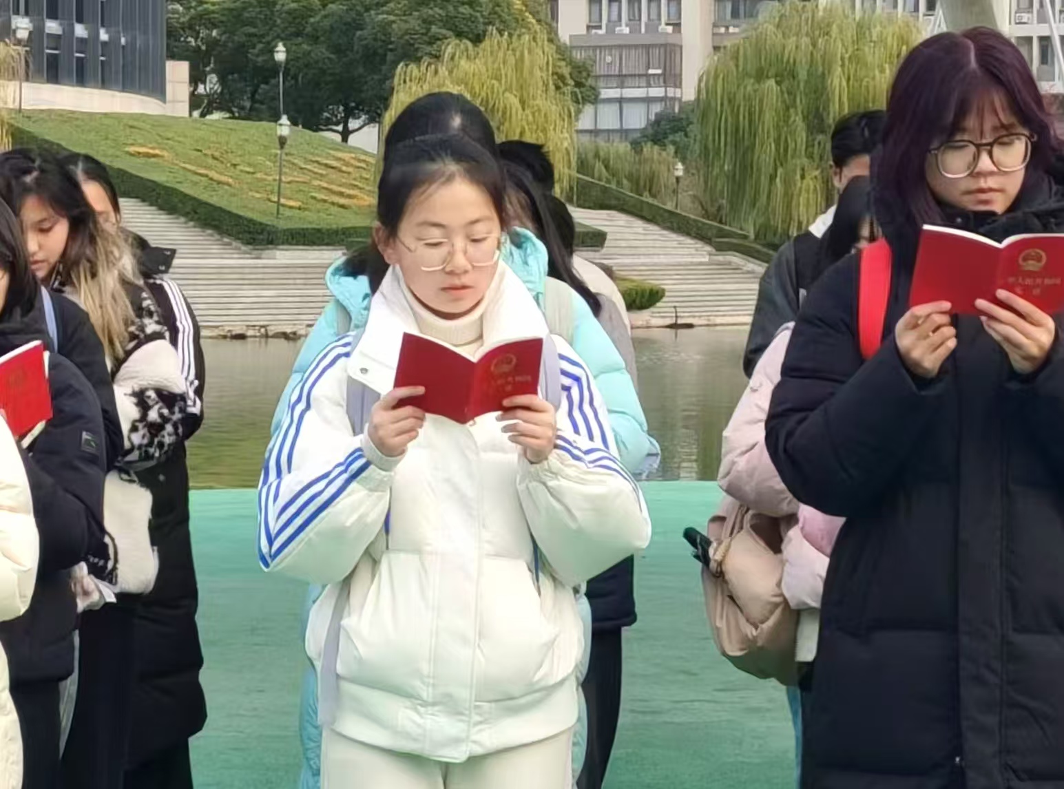 12月3日早晨7时,参与晨读活动的同学们在镜湖南侧映月台朗读宪法法条。朗朗诵读声吸引了许多路过的同学,使大家了解了宪法知识与宪法日,体悟了宪法精神,对公民权利与义务的认知更为深刻,进一步夯实了大家的宪法知识基础,切实加深了他们对宪法的理解。朗读活动结束后,法律援助中心的同学们对具有代表性与教育意义的法条进行了热烈的讨论,深入探究宪法精神的内涵。讨论过程中,同学们结合实际案例,探讨宪法在校园生活、社会治理等方面的具体应用与体现。
