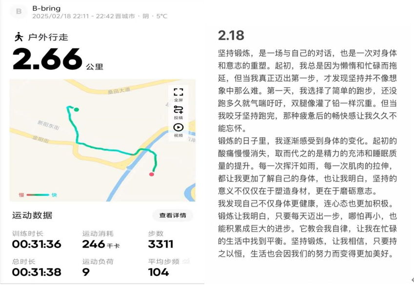 “这不是简单的签到活动,而是希望同学们在坚持中培养自律意识,在运动中感悟成长。”活动负责人薛同学介绍,每日心得着重记录运动过程中的真实体验,最终总结需系统梳理个人在身体素质、时间管理、情绪调节等方面的收获。
