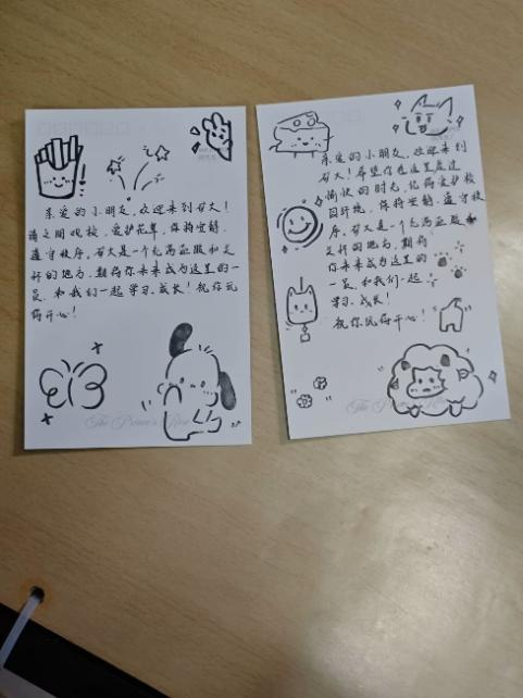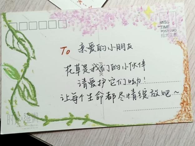 活动期间,志愿者们认真绘制明信片,写下文明观校的提示语以及对小朋友们的真挚问候与祝福,介绍了校园文明的重要性,并用简单易懂的图文讲解了文明观校的要点,如爱护校园环境、遵守校园秩序、文明参观校园景点等。“轻轻走路,静静参观,做文明小使者”“爱护校园花草,让美丽常驻”“有序参观不拥挤,文明礼貌记心间”等一句句充满童真又意义深刻的话语跃然纸上。志愿者在绘制完成后将精心制作的明信片分发给入校参观的小朋友,与来访的家长和小朋友们进行友好交流。收到明信片的家长感慨道:“这个活动特别有意义,孩子收到的卡片不仅加深了她对文明观校的理解,还能通过明信片把这份文明传递出去,非常值得点赞!”志愿者顾锌娟也表示:“看到孩子们对明信片表达了喜爱,感觉自己的努力很有价值,希望这些明信片能让更多人关注到校园文明,一起守护美好的校园环境。”