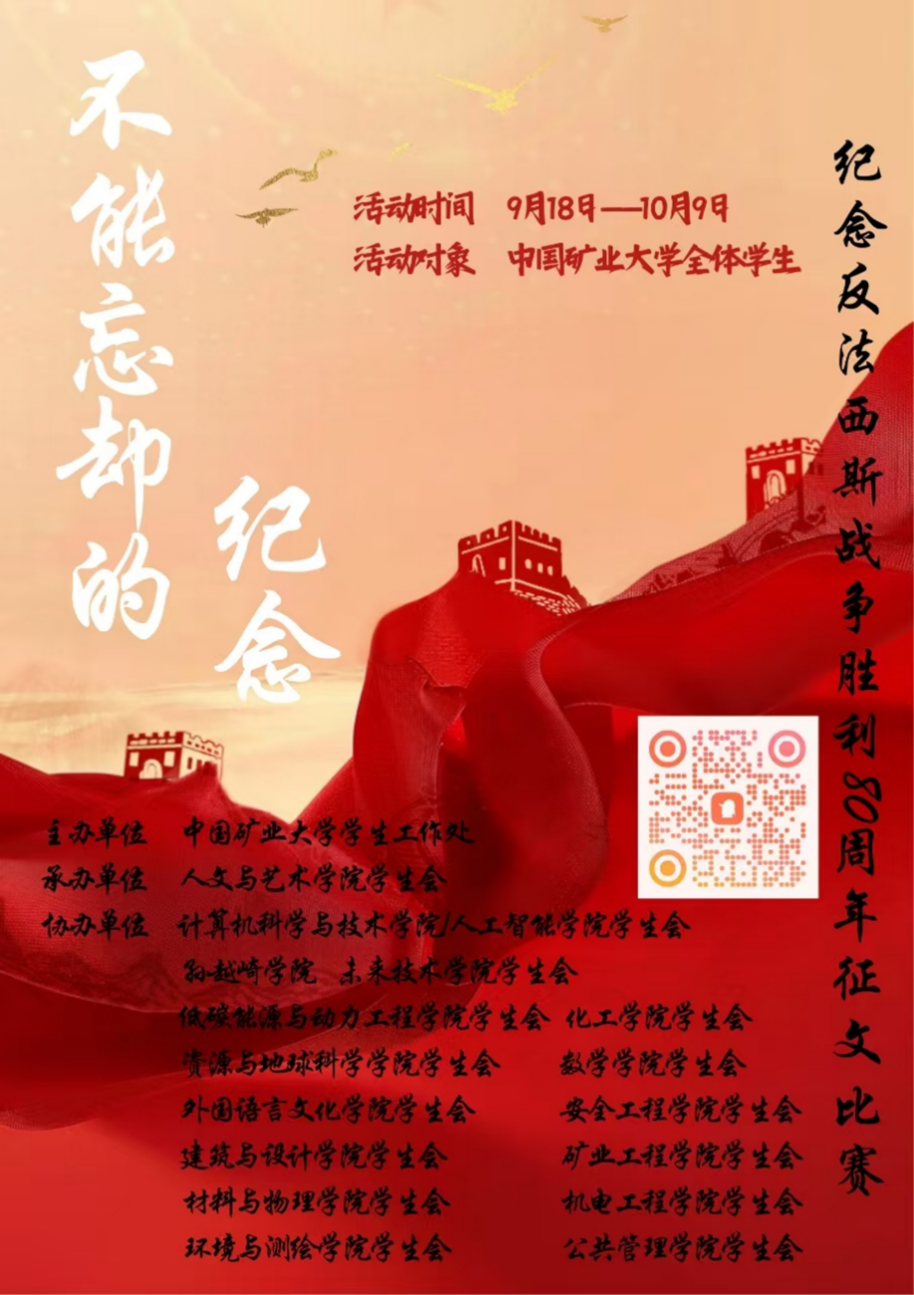 由校学工处主办,院团委、院学生会承办,矿业工程学院、公共管理学院等14个学院学生会协办的“不能忘却的纪念”——纪念中国人民抗日战争暨世界反法西斯战争胜利80周年征文比赛顺利举行。经承办学院学生会初步筛选、承办和协办学院学生会根据主题贴合度、思想深度等5个方面综合评分,尚煜坤等11名同学荣获一等奖,程紫倪等23名同学荣获二等奖,贾可心等34名同学荣获三等奖。
