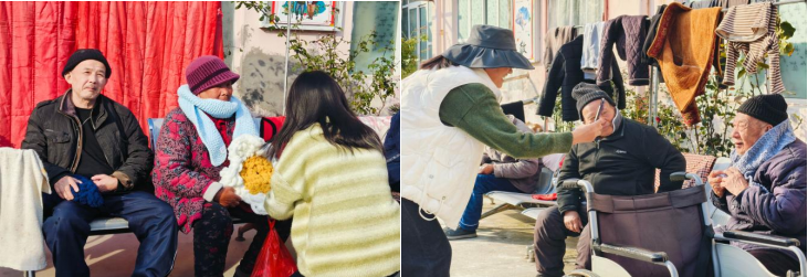 活动期间,志愿者们分为手工、书画与节目三个小组,以不同方式为老人们送去陪伴与欢乐。手工组的同学们匠心独运,飞针走线,一顶顶针织帽编织着细致的牵挂,一副副手套包裹着温暖的守候,一个个坐垫承载着柔软的关怀;书画组的志愿者们与长者共同执笔,在宣纸之上挥毫泼墨,写下“福寿安康”等吉祥祝愿,以流畅的笔触为老人勾勒出一幅幅生动传神的简笔肖像;节目组的同学们则以歌声与舞蹈点燃现场氛围,让往日宁静的院落充满欢声笑语,传递青春的活力与温暖。