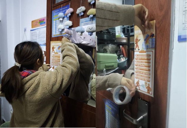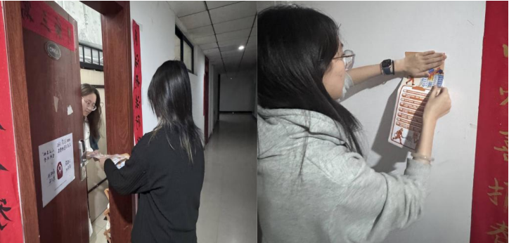学生会生活部精心设计制作了宣传海报,普及消防安全知识,包括宿舍常见火灾隐患、灭火器使用方法及逃生自救要点等。其中,大海报张贴于竹一楼学生活动室宣传栏,并印制多份小海报,由各班安全委员分发至每间本科生宿舍,确保消防安全提示覆盖到每一位同学。同时,学院组织全体本科生、研究生宿舍开展消防安全自查和抽查。各班安全委员带领宿舍成员,对照消防安全要求,重点检查宿舍内是否违规使用大功率电器、消防通道是否保持畅通等关键环节。自查过程中,同学们相互提醒、查漏补缺,对发现的小问题及时整改,进一步强化了“宿舍安全我有责”的主体意识,也将消防安全防范工作落到了实处。