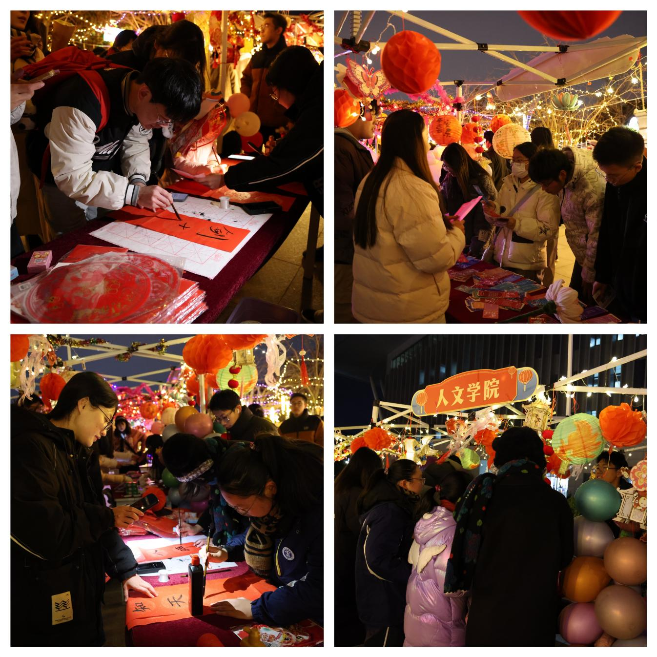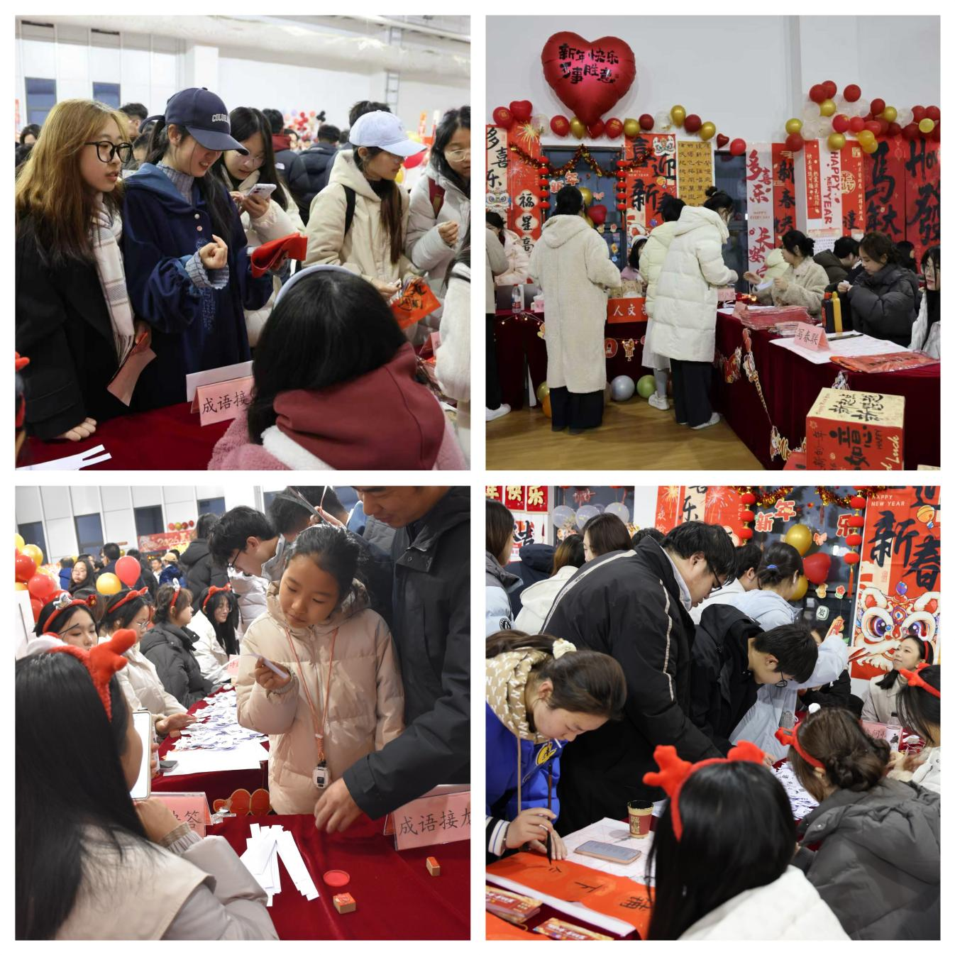 的“游艺宫”活动在体育馆B207进行,活动现场年味浓厚,氛围热烈,多项趣味游戏吸引众多师生参与。活动现场准备了金属书签、钥匙扣礼品。“写春联”“诗词拼贴坊”“快问快答”“成语接龙”等充满趣味的文化活动,让大家在享受欢乐节日氛围的同时,感受传统文化的魅力。现场洋溢着热闹而温馨的氛围。灯展活动在体育馆前举行,学生们将自己的巧思构想融入到灯笼制作中,各式各样富含传统文化韵味的作品引人驻足观赏。现场师生踊跃参与猜灯谜、写对联等互动活动,在传统文化的趣味体验中,共同感受浓浓的节日氛围。