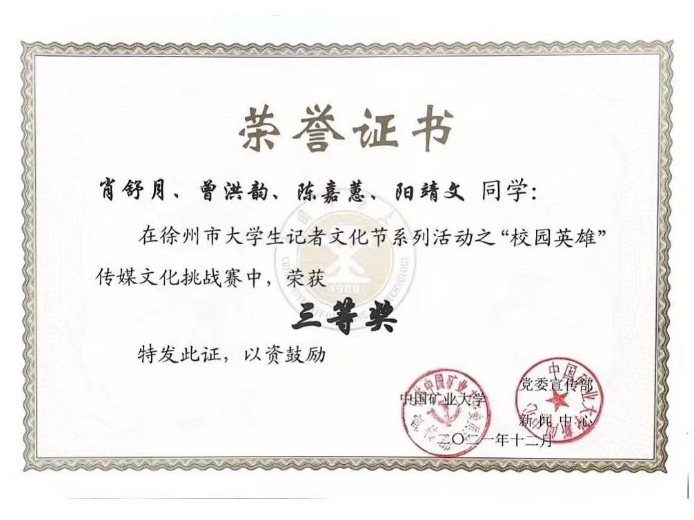 广播电视学2020级本科生,保研至暨南大学新闻传播学。曾获2023年全国大学生英语竞赛C类三等奖、“批改网杯”全国大学生英语写作大赛优秀作品奖、徐州市“花开徐州 春满彭城”短视频作品大赛一等奖、徐州市大学生记者文化节系列活动之“校园英雄”传媒挑战赛三等奖、广播剧社年度话剧公演活动“大戏之夜”二等奖、“学宪法 讲宪法”短视频大赛三等奖、“安全让生活更美好”短视频大赛三等奖,获麻豆av