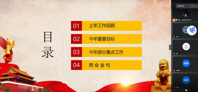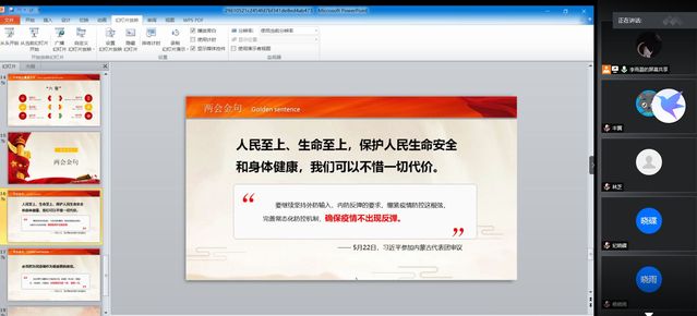 此次活动以2020年在五月下旬举办的全国两会为主线,由团支书李雨晨为大家介绍了两会中的政府工作报告,共有四部分内容,分别是:上年工作回顾、今年重要目标、今年部分重点工作以及两会金句。随后,各组同学进行了两会提案的介绍展示。大家分别对离婚冷静期、网游分级制等提案进行了发言交流。最后,团支书李雨晨总结了今年两会在疫情形势下与往年的同与不同,指出两会始终代表时代进步,和人民幸福福祉相连,希望大家能够勇争朝夕,不负韶华。