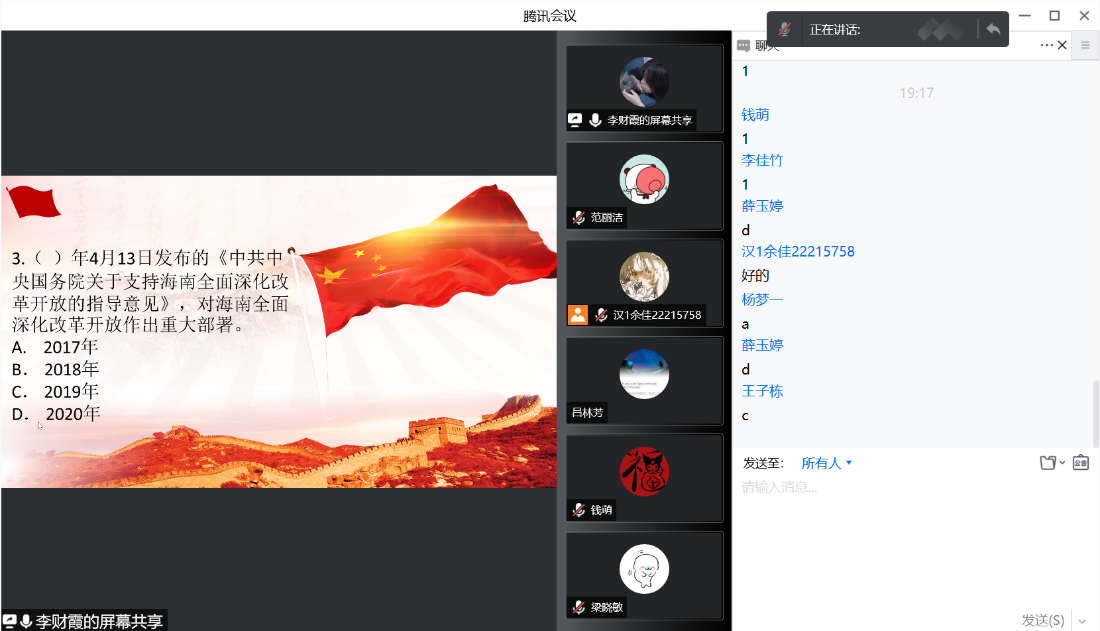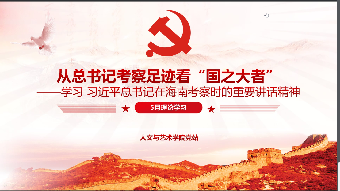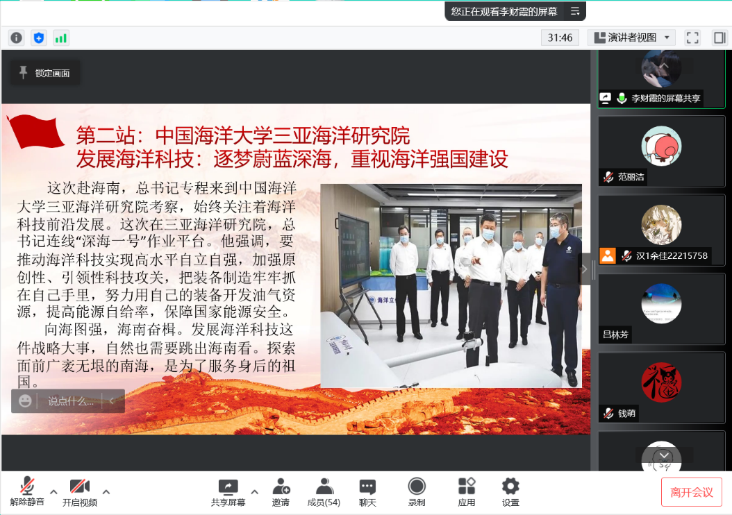 5月7日晚,麻豆av 党站全体成员在腾讯会议开展线上理论学习,学习习近平总书记在海南考察时的重要讲话精神。在主持人带领下,同学们首先自行阅读了解3月1日至4月21日的新闻热点,而后在主持人的带领下,从学习目的、考察背景、过程回顾、互动答题四个方面开展学习,本次理论学习形式新颖,同学们积极回答问题、参与互动,深入了解了习近平总书记海南考察的系列精神、经济特区建设情况和海洋发展战略,取得良好成效。